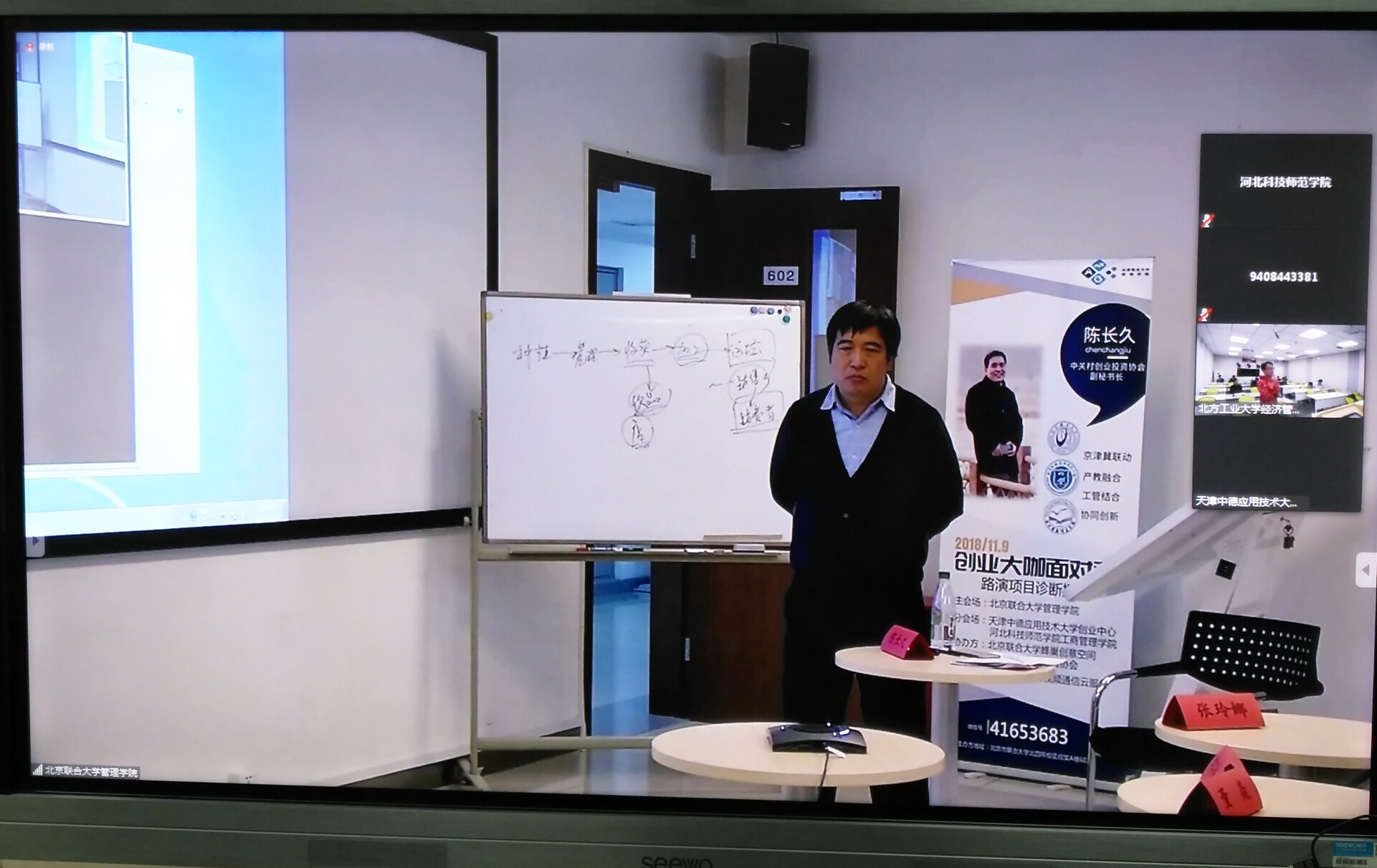 网络会议主要内容包括分布式路演与异地点评,该项活动特聘北京中关村创业投资和股权投资协会副秘书长陈长久为创业导师,他分别对爱心超市、足球孩、耳榄、海河鸿文这4支老员工路演团队进行了现场点评和指导。