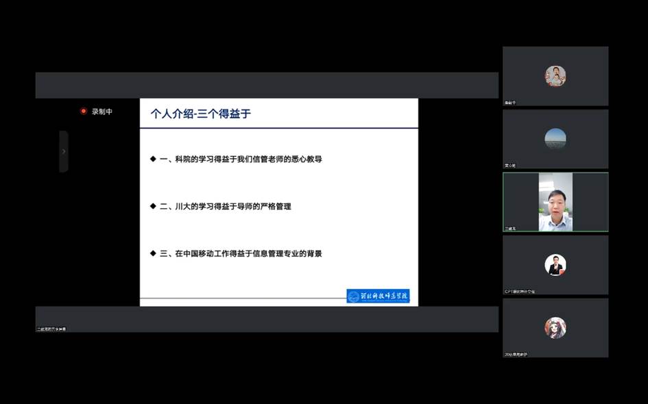 优秀员工兰建龙,结合自身的学习经历和工作行业背景,探讨了当前社会经济变革现状,点出了当前信息行业发展的新契机,并给学弟学妹的职业规划和个人素质培养提出了热忱、中肯的建议。优秀员工孙立强,从员工时代开始讲述自己的学习、奋进到最后成功的经历,深入浅出的讲述了从一个职场小白到职场精英的奋斗历程,为在校生道出了成功的秘籍——拼搏拼搏再拼搏。优秀员工魏秋实,讲述了自己三次考研的经历、读博的感悟,情真意切、感人至深,为在校生讲出了成功的真谛——坚持坚持再坚持。优秀员工贾文赞,讲述了自己从实习到入职入行再到开拓创业的经历,重点分享了自己的发展道路上的挫折及其带来的成长,为在校生点出了成功的阶梯——实干实干再实干。优秀员工刘垒,讲述了自己对于信息系统开发的见解,剖析了性格与岗位选择的关系,真刀实枪,句句发自肺腑,为在校生说出了成功的道路——努力努力再努力。还有余飞、陈建强等优秀员工,也从自己的工作、学习、创业等方面讲述了个人的经历和感悟,为信息管理与信息系统专业的在校生呈现了一系列精彩的讲座。